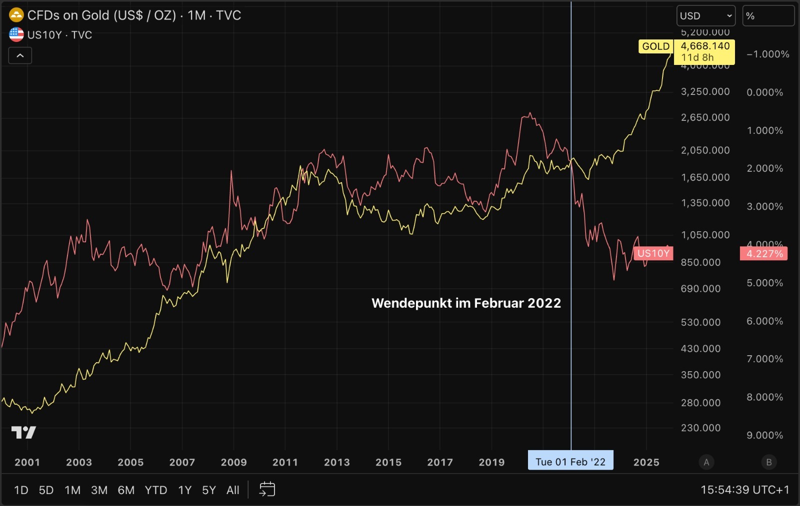 Das änderte sich im Februar 2022, nachdem die russische Armee in die Ukraine einmarschiert war und der Westen beschloss, die russischen Dollarreserven einzufrieren. Seitdem ist der Zinssatz für 10-jährige US-Kredite enorm gestiegen, hat aber das umgekehrte Verhältnis zu Gold durchbrochen, und auch das Edelmetall begann explosionsartig zu steigen.